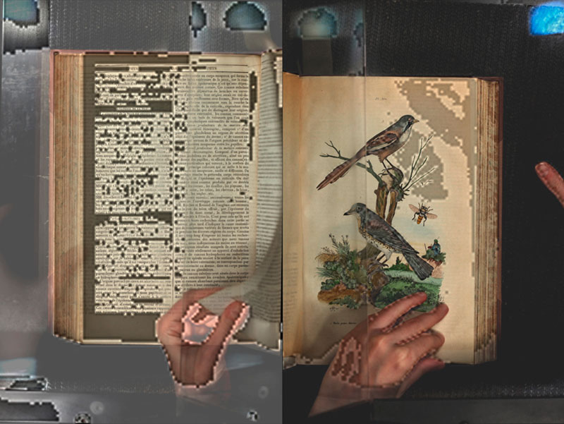 gehören. Erstaunlicherweise erscheint auf einem unserer Computer das komprimierte Bildformat JPG2000 in der Archivsoftware mit systembedingten digitalen Artefakten, die das Bild auf eine komplett andere Ebene schieben. Das fehlerhafte Bild zeigt sich als rätselhafte Schönheit, ein ästhetischer Schatz, der sich einer zeitlichen Zuordnung entzieht. Nicht wir stellen also diese Bilder her, das macht die Software aufgrund eines uns unbekannten Fehlers in der Konfiguration dieses einen Computers. Unsere künstlerische Arbeit besteht im Suchen, wir filtern heraus, sammeln und materialisieren, es entstehen Lithografien und fotografische Belichtungen. Die Flüchtigkeit der Bilder zeigt sich am deutlichsten in einem Video, das 300 dieser Bilder in einer zeitlichen Sequenz zeigt, parallel und gegenläufig, geteilt in linke und rechte Buchseiten.